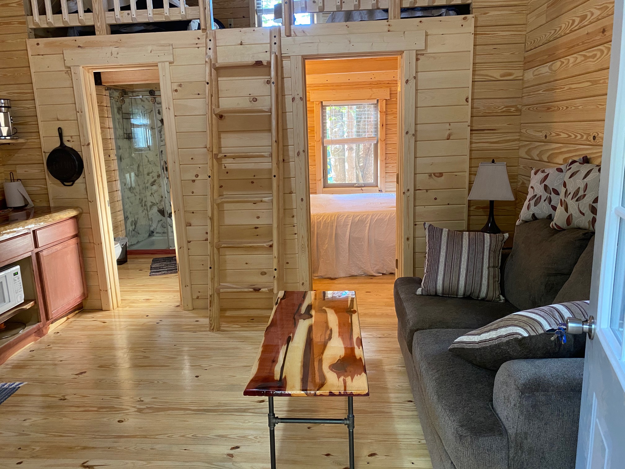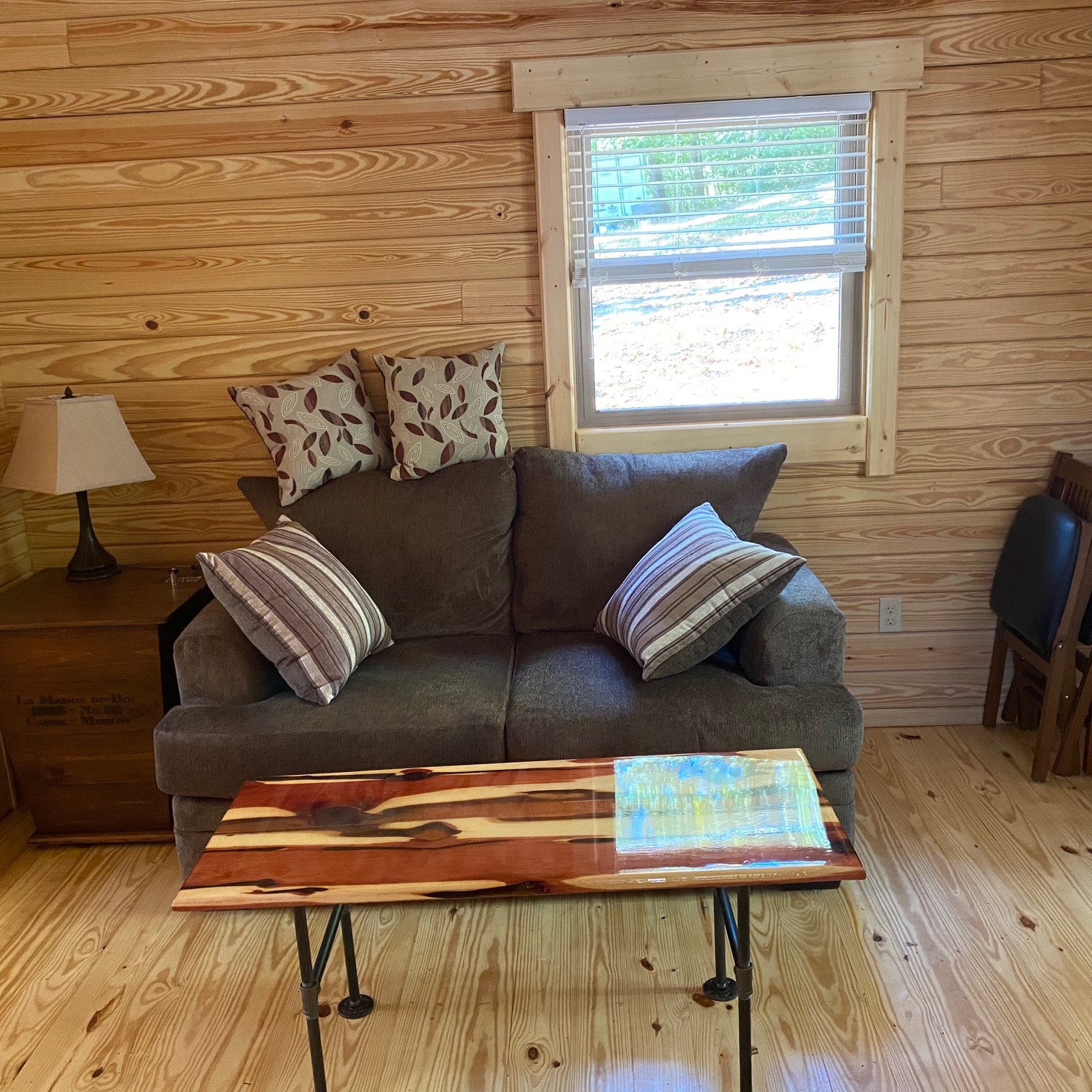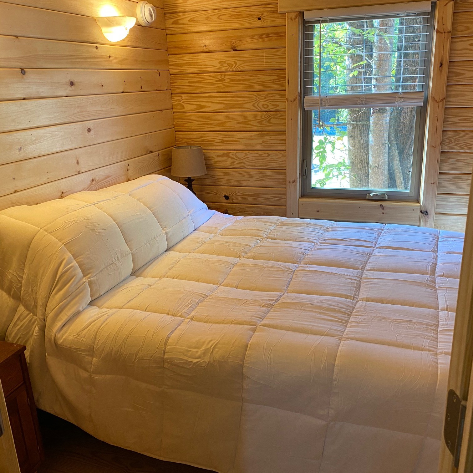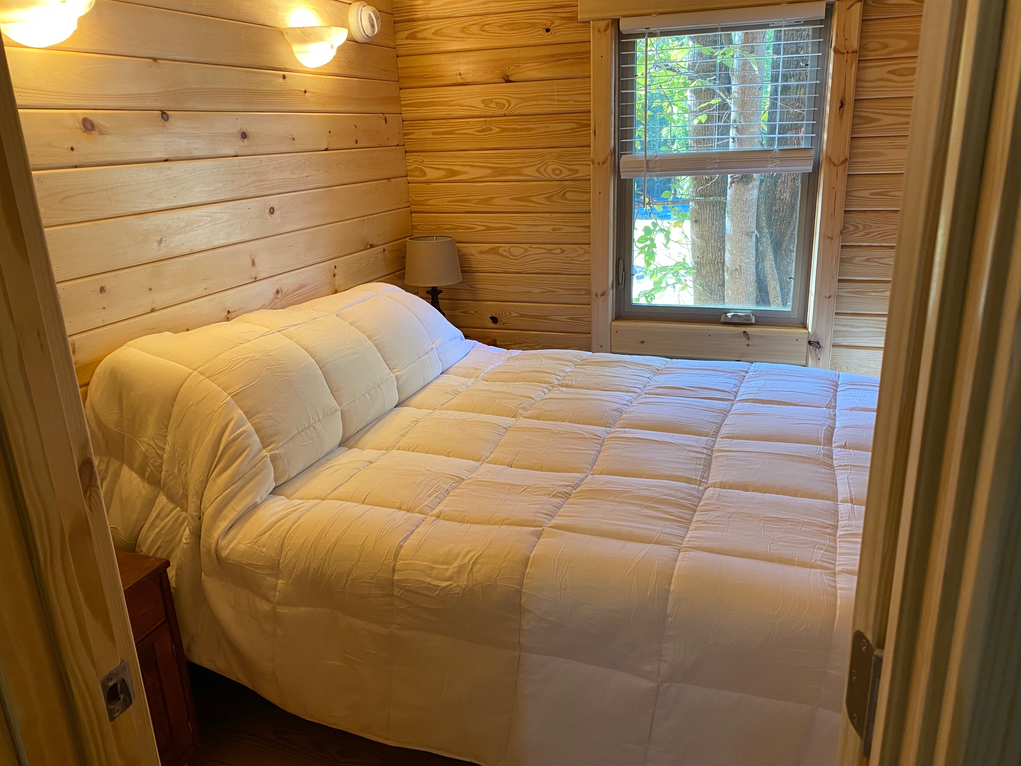 This 427 square foot cabin contains 1 bedroom and 1 loft with access to 55 acres of woodlands and 1.5 miles of rugged hiking trails. Catch an evening’s meal starting June 22, 2021 at our 1/4 acre spring-fed fishing hole. Please see our Onsite Information and Policies page for more information.